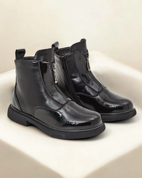 - Прекрасни детски ботуши с равна подметка, изработени от комбинация от еко кожа и еко кожа с лак. Вътрешността на ботуша е подплатена с мека, удобна кожа. Закопчават се с цип.