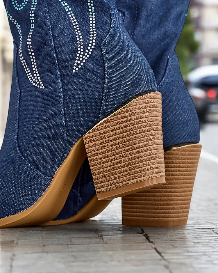 - Боти в каубойски стил с токчета, изработени от синтетична кожа, приличаща на замша. Еко кожена стелка, обувките се закопчават с цип, стеблото е декорирано с кристали. Подходящи са за много женски стилове!