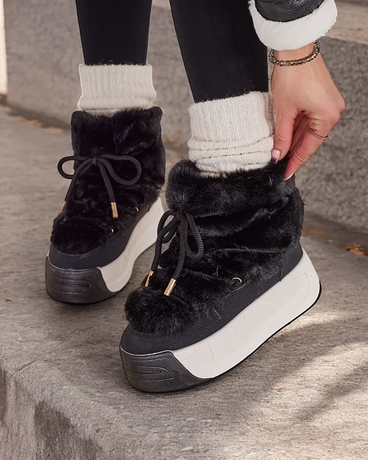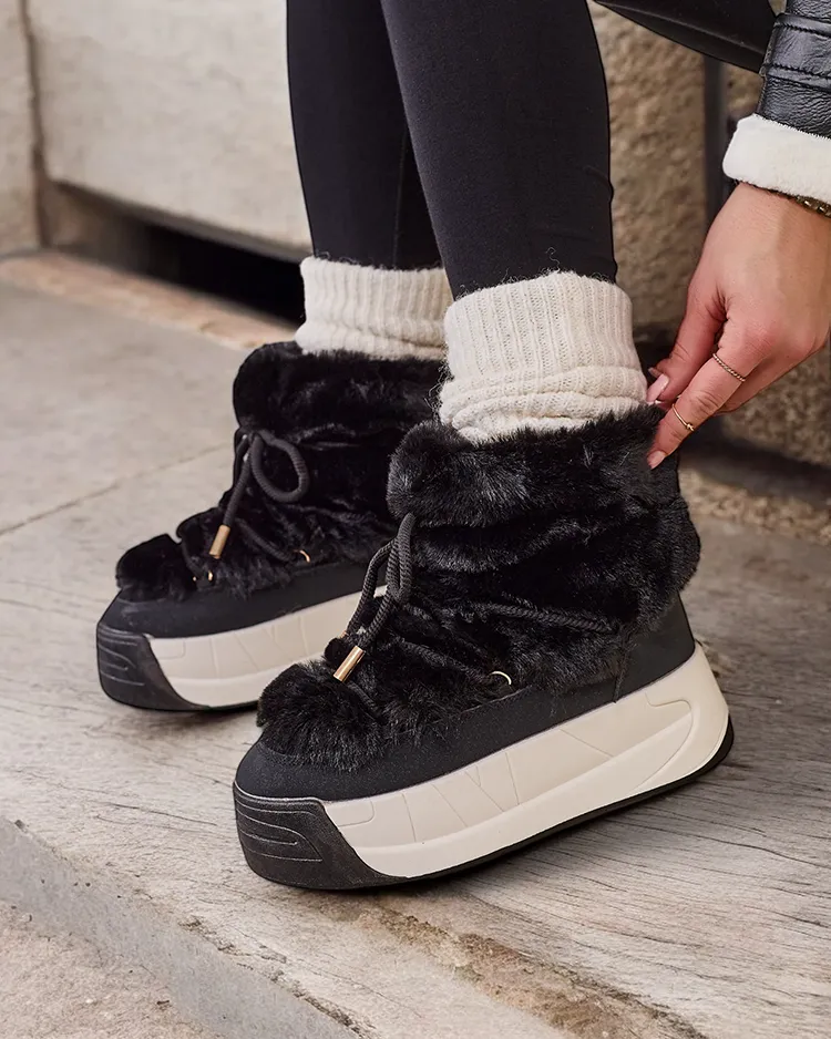 - Дамски снежни обувки със стъбло от комбинация от еко кожа и приятна материя. Вътре има приятно подплата от кожа, обувките имат връзки през стъблото. Идеални за зимата!