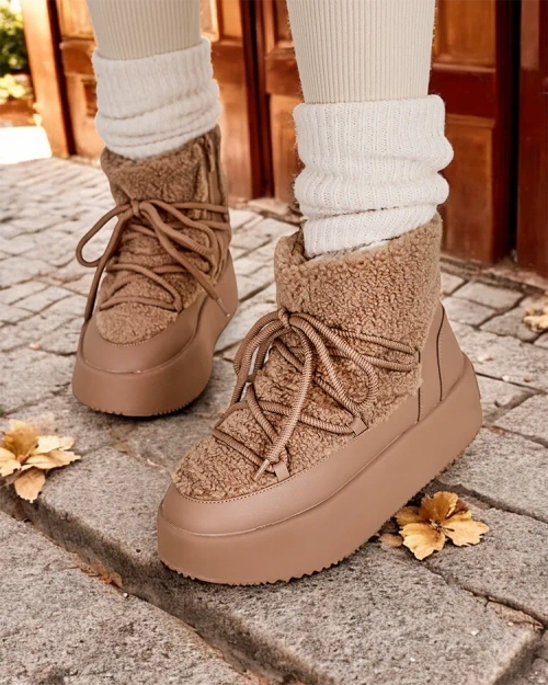 - Дамски снежни боти с върховата част, изработена от комбинация от еко-кожа и приятна текстил. Вътре имат удобна подплата от кожа, ботите имат цип и връзка на върха. Идеални за зимата!