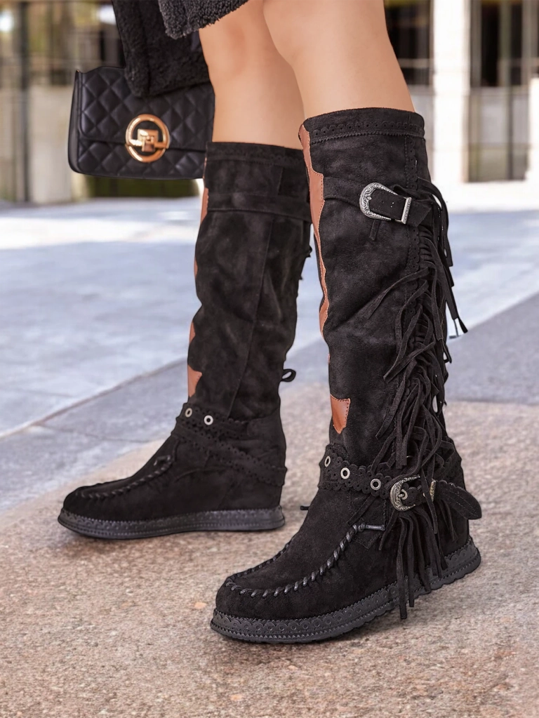 • Ботуши със скрита тока, изработени от изкуствена велурена кожа. Моделът има декоративни бордюри. Обувките са с пухено подплата. Подходящи за много женски стилове!