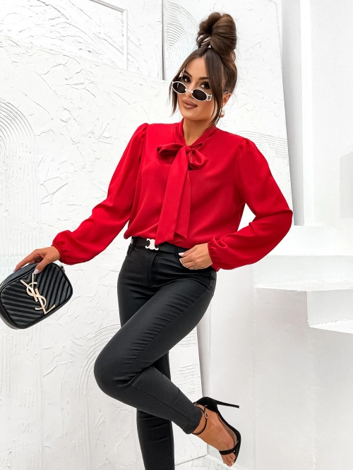 • Елегантна блуза с деликатно връзана панделка на деколтето подчертава женствената финес. Мекият материал обгръща силуета, а панделката добавя изтънчен акцент. Идеална за вечерни разходки и специални поводи!