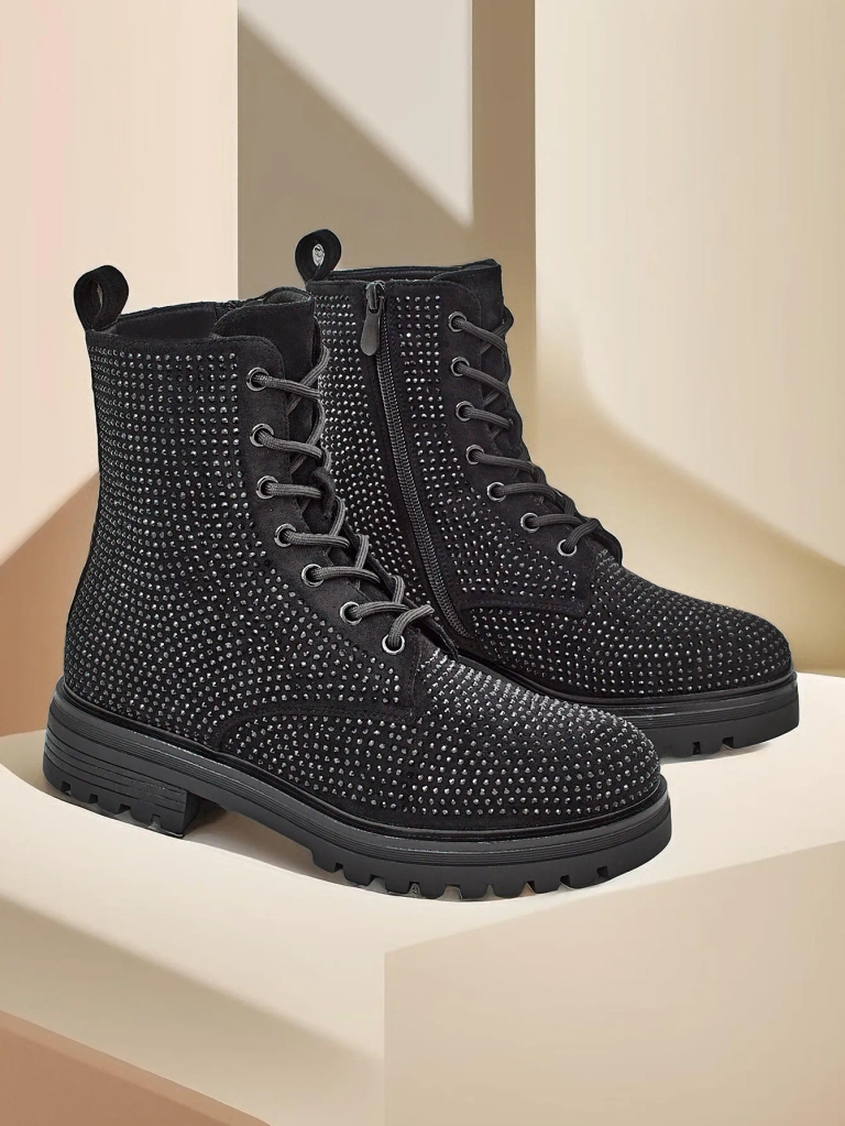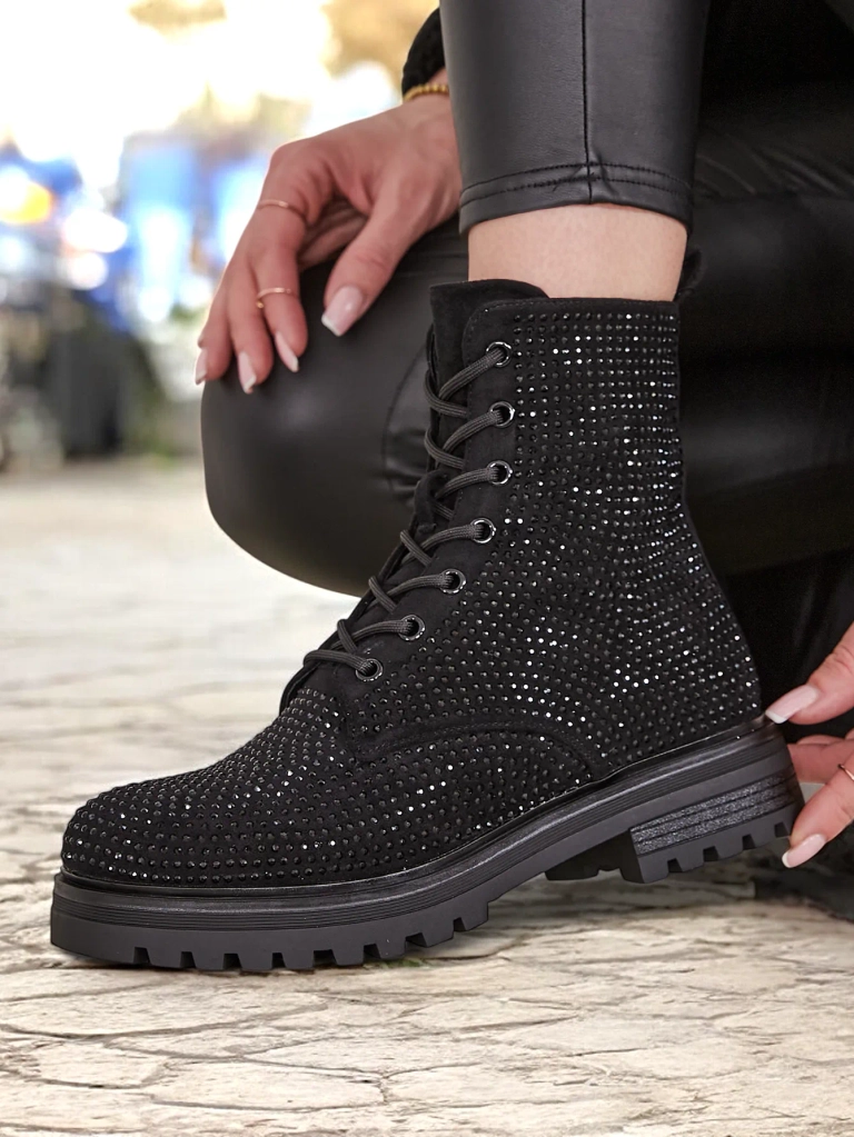 - Стилни боти от еко велур и платена вложка. Обувките са с връзки и цип закопчаване. Моделът има по-дебела подметка и е украсен с цирконии. Идеални за есента!