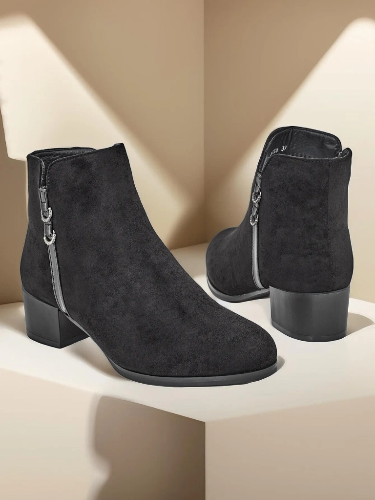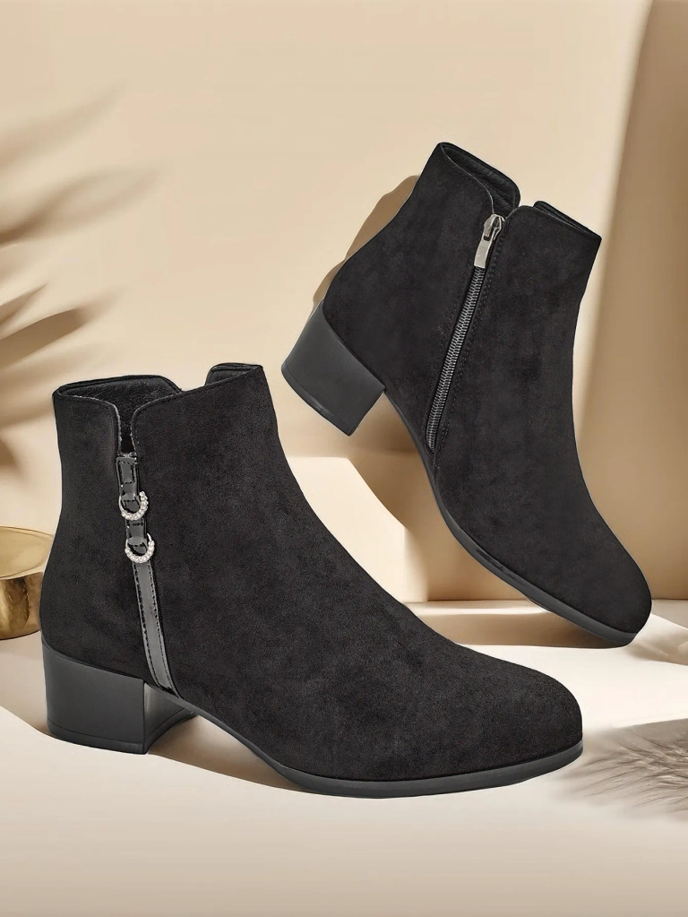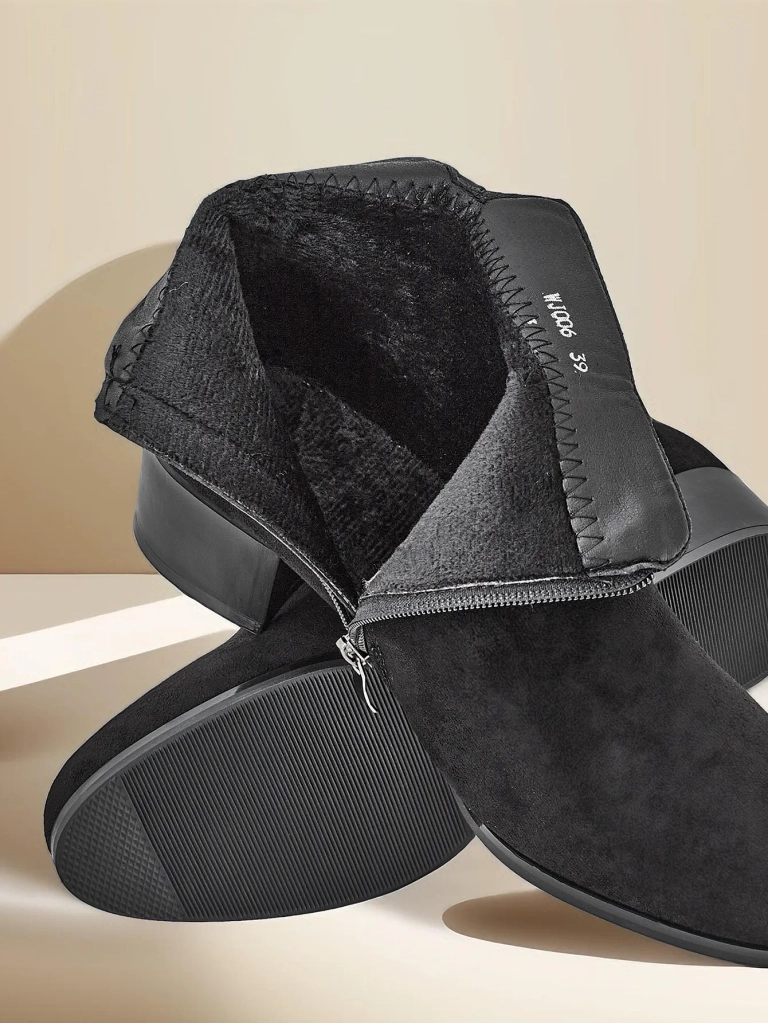 - Фантастични дамски ботуши с нисък ток, изработени от еко велур. Вътрешността е от деликатно кожухче. Моделът се закопчава с цип. Идеални за есенни тоалети!
