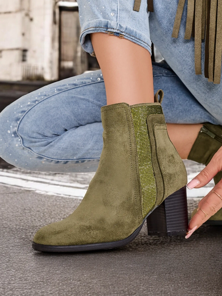 - Дамските ботуши до глезена са идеалното решение за по-студените дни. Горната част от фалшива кожа е закопчана с цип, с фалшива кожена стелка вътре. Пост модел, с кръгло бомбе. Отлично допълнение към вашите ежедневни тоалети!