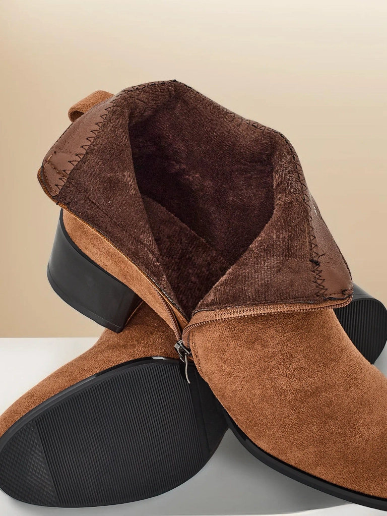 - Stylowe damskie botki to idealne rozwiązanie na chłodniejsze dni. Eko zamszowa cholewka jest zapinana na suwak, a w środku znajduje delikatne ocieplenie. Model na płaskim obcasie z okrągłym noskiem. Super dodatek do Twoich casualowych outfitów!