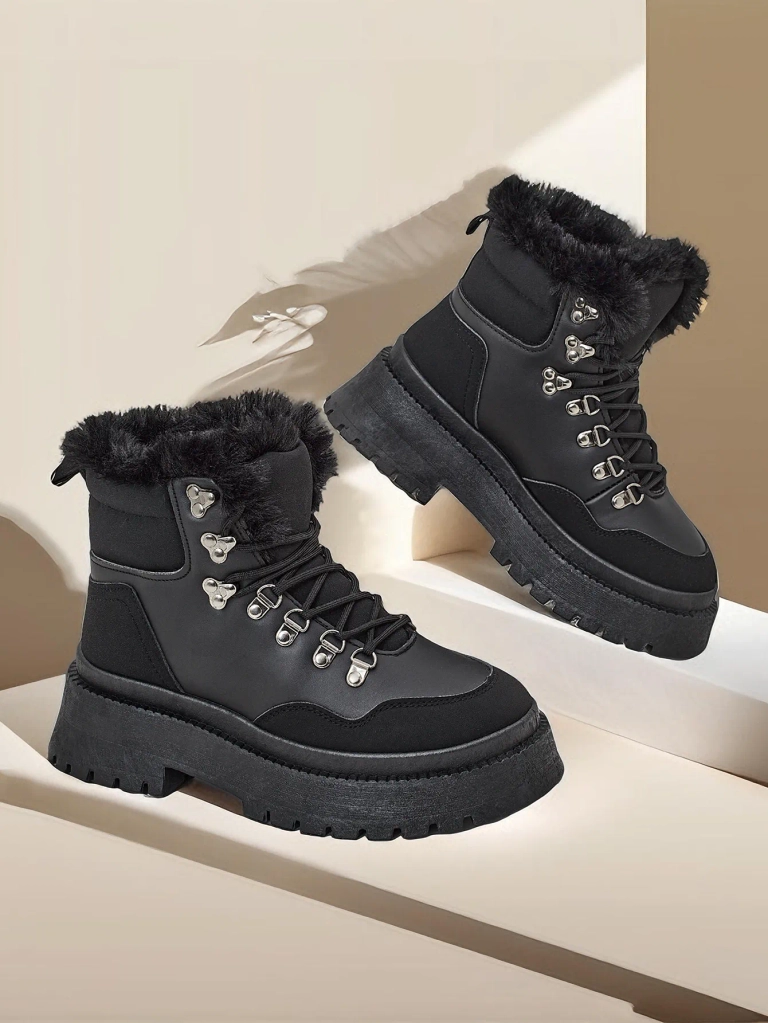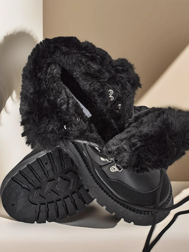 - Дамски ботуши за сняг с горна част от еко кожа. Облицовани с изкуствен мех отвътре, с дизайн на сложване и връзки. Идеални за зимата!