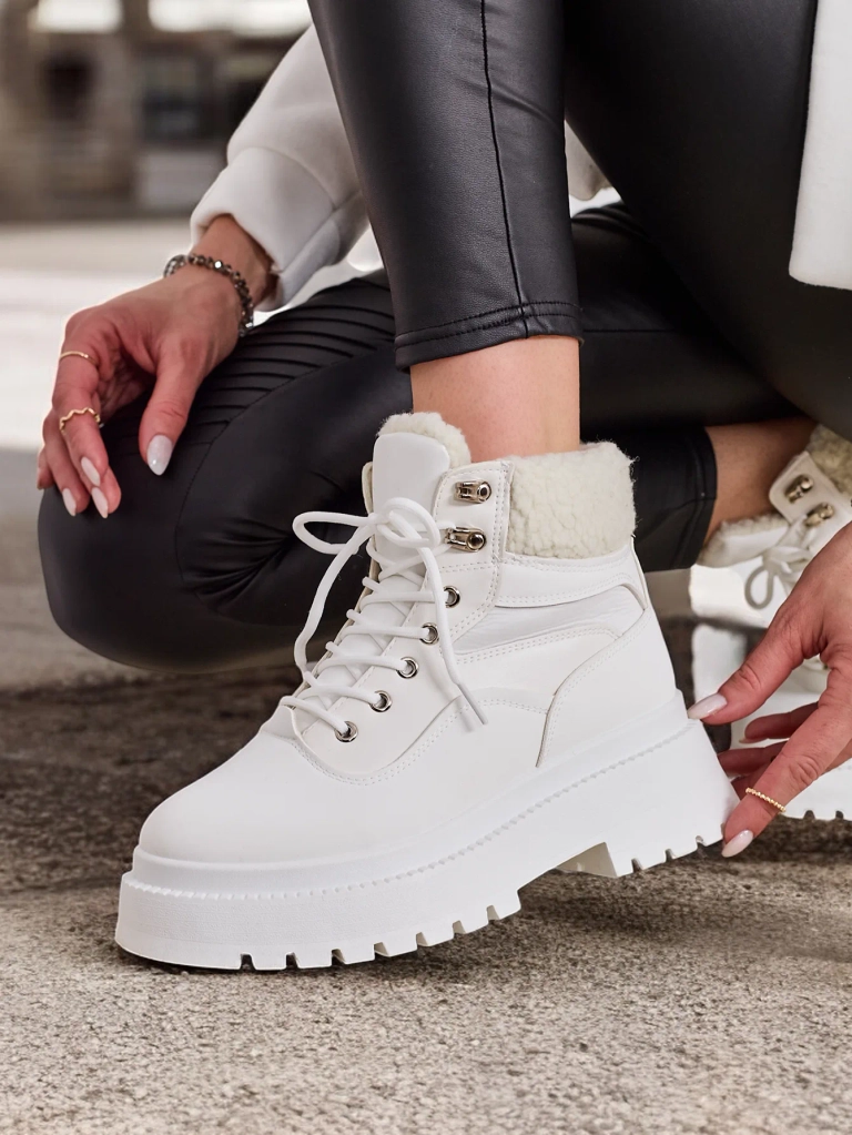 - Вечни дамски сняг ботуши на плътна подметка. Горната част е изработена от еко кожа. Вътрешно има подплата във формата на козинка, обувките се връзват. Перфектни за по-студените сезони!
