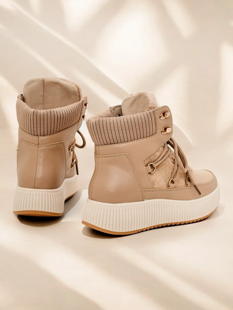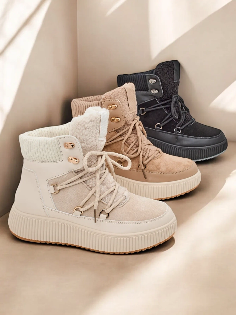- Вечните дамски снежни ботуши с дебела подметка. Горната част е изработена от еко-кожа. Вътрешно подплатени с косъм, връзки. Идеални за по-студените сезони!