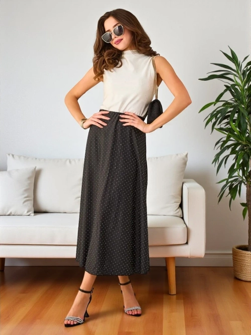 - Дамска миди пола, изработена от мек плат. Моделът е декориран с пайети навсякъде. Идеална основа за много уникални тоалети! ЗАБЕЛЕЖКА: Точност на измерването (+/-) 1 см.