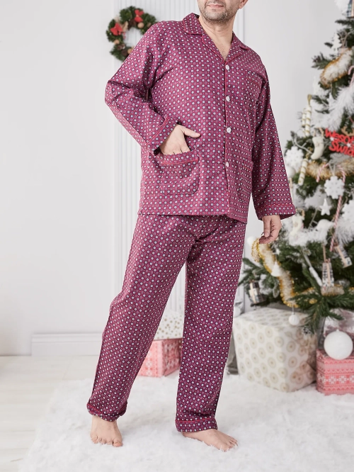 - Мъжки пижами с модерна щампа, изработени от памучен материал. Моделът има дълъг ръкав и панталон. Горната част се закопчава с копчета. Комфорт и елегантност в едно!