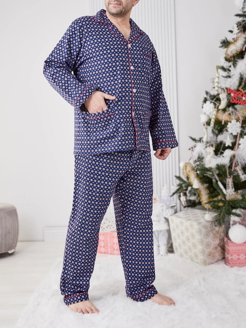 - Мъжки пижами с модерна щампа, изработени от памучен материал. Моделът има дълъг ръкав и панталон. Горната част се закопчава с копчета. Комфорт и елегантност в едно!