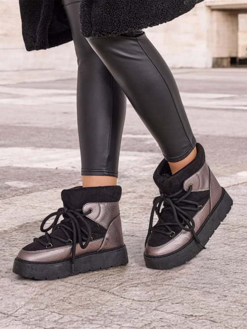 - Дамски боти за сняг със сая, изработени от комбинация от еко кожа и еко велур. Вътре приятен козинов плат, връзки и обувки. Идеални за зимата!
