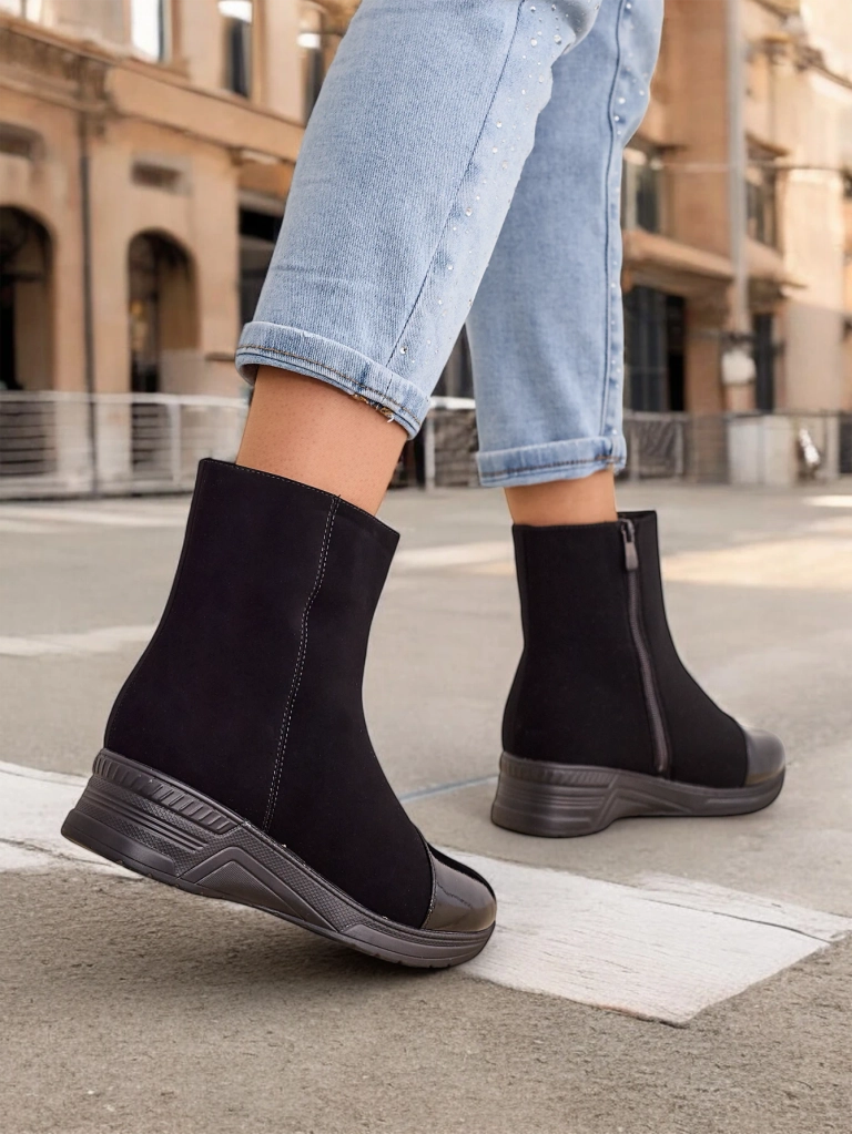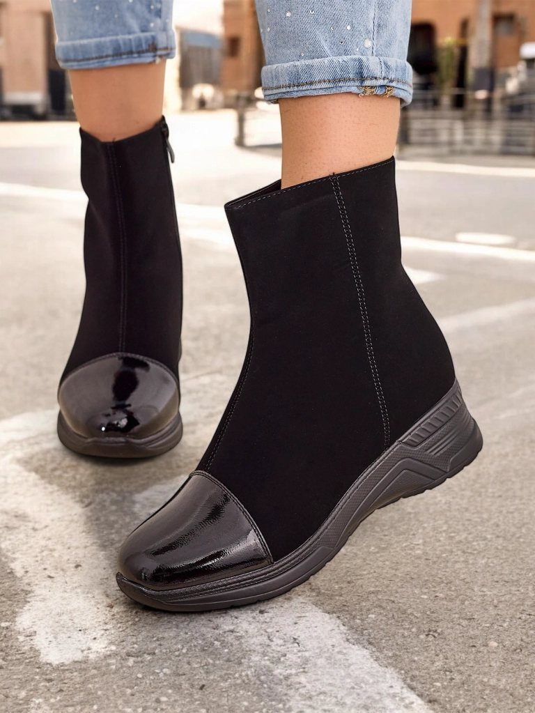 - Фантастични дамски боти с ток, изработени от матов еко кожа с лаков нос. Вътрешността е от приятно козинче. Моделът е с цип. Идеални за есенни тоалети!