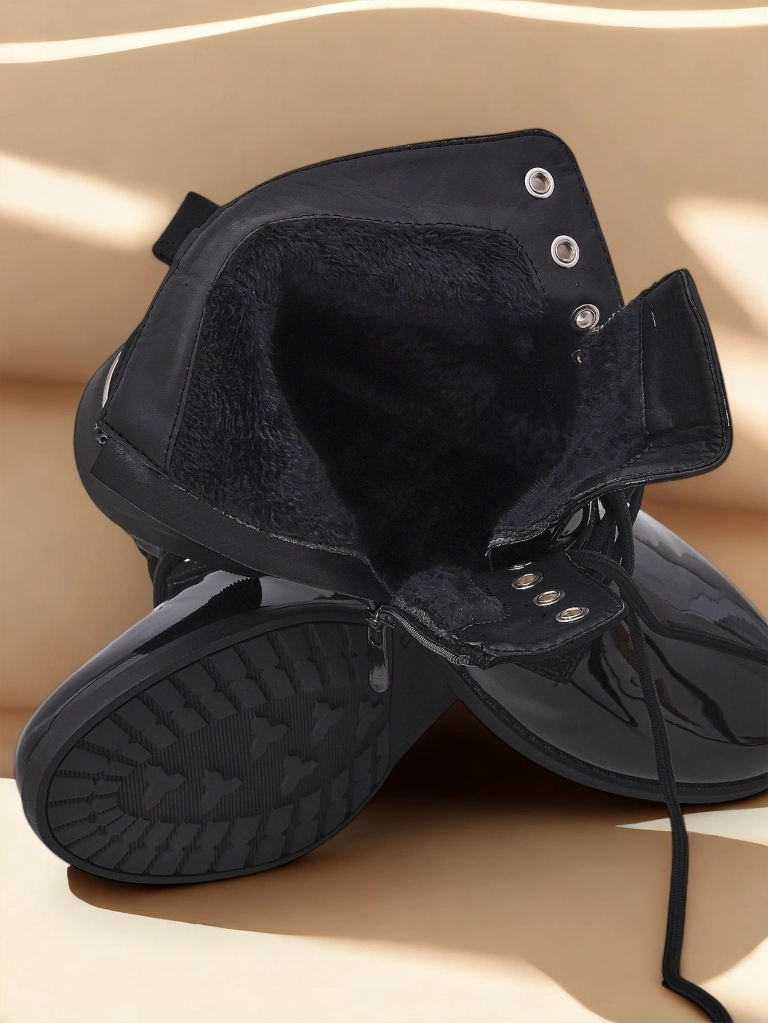 - Стилни ботуши от еко кожа. Обувките са на връзки. Моделът има равно подметка и подплатено с козина. Идеални за есента!