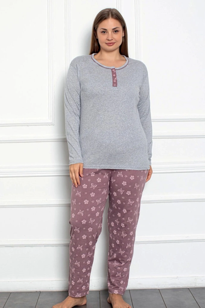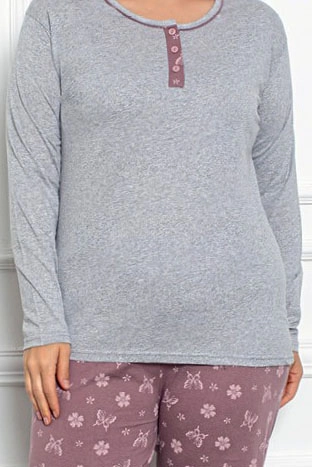 - Дамският пижамен комплект с 2 части е изработен от памучен плат, завършен с декоративен принт. Комплектът включва блуза с дълъг ръкав и копчета и панталони с еластичен колан и прави крака.