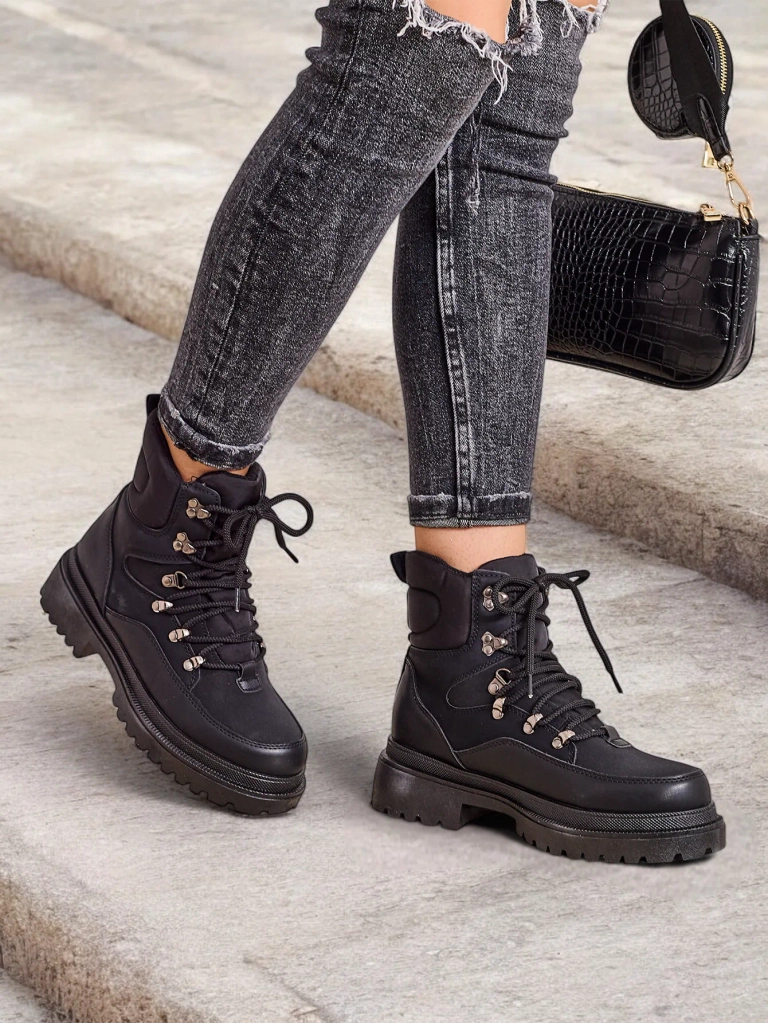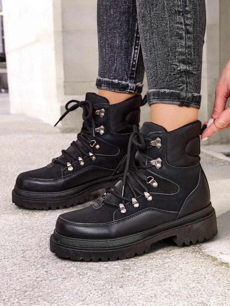 - Уникални дамски ботуши трапер, изработени от комбинация от еко кожа, матова еко кожа и плат. Моделът има върхове на връвчици. Запълнени с по-дебела пяна и плат отвътре. Специфични обувки за лошо време!