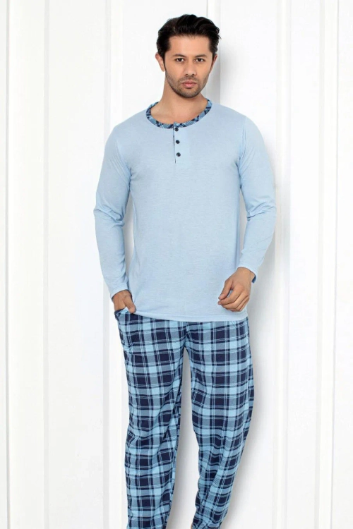 • Изключителна мъжка пижама, изработена от памучен материал. Моделът разполага с дълги ръкави, два джоба и дълги крака. Комфорт и елегантност в едно!
