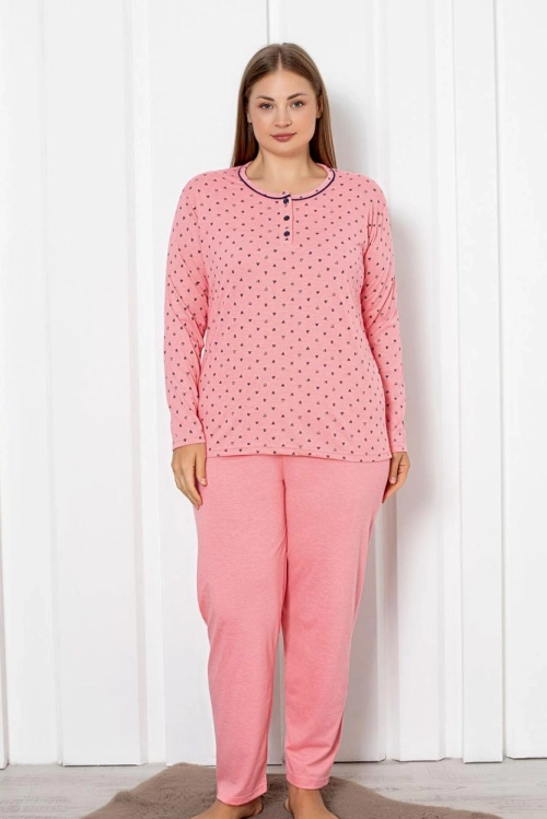 • Дамски 2-частов пижамен комплект, изработен от памучен плат, завършен с декоративен принт. Комплектът включва риза с дълъг ръкав и копчета и панталони с еластичен колан и прави крачоли.