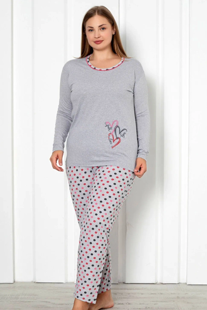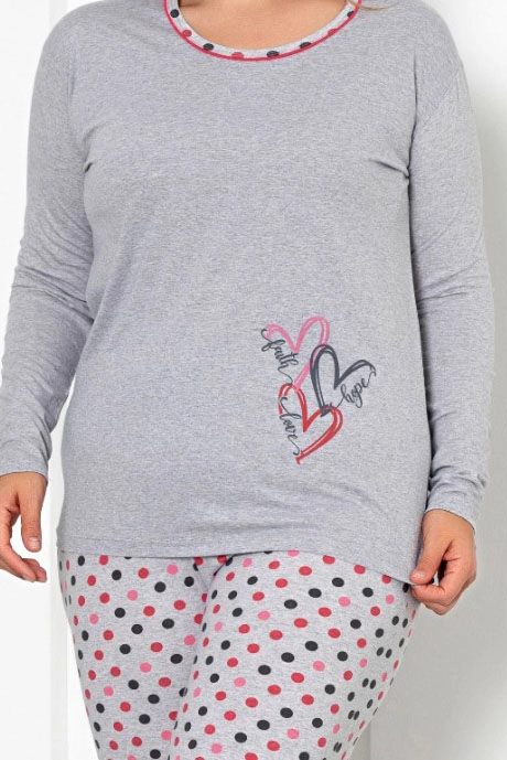 - Женски 2-частен пижамен комплект, изработен от памучен плат, завършен с декоративен принт. Комплектът включва горна част с дълги ръкави и панталони с еластична талия и прави крачоли.