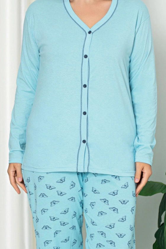 - Дамска 2-частна пижама, изработена от памучна материя и завършена с декоративен принт. Комплектът включва блуза с дълъг ръкав и копчета и панталони с ластична талия и прави крачоли.