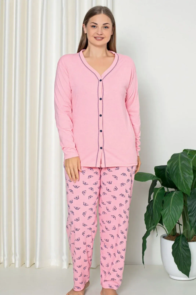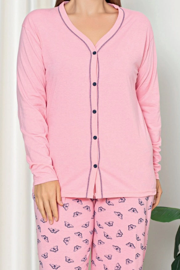 - Дамска 2-частна пижама, изработена от памучна материя и завършена с декоративен принт. Комплектът включва блуза с дълъг ръкав и копчета и панталони с ластична талия и прави крачоли.