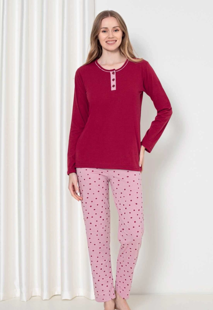 - Двоен комплект пижама за жени с дълги ръкави и дълги крака, изработен от памучен материал. Моделът е декориран с печат. Перфектен за уютни вечери вкъщи! ЗАБЕЛЕЖКА: Точност на измерванията (+/-) 1 см.