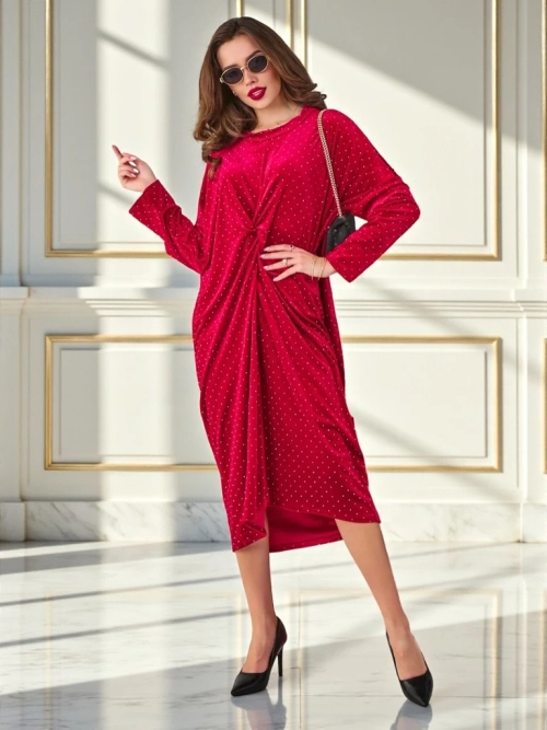 - Красиви макси рокля с набиране, изработена от приятна материя, наподобяваща кадифе. Продуктът разполага с кръгло деколте, дълги ръкави и прав кройка. Цялата рокля е украсена с камъни. Фантастична рокля за вечерта! ЗАБЕЛЕЖКА: Точност на измерванията (+/-)