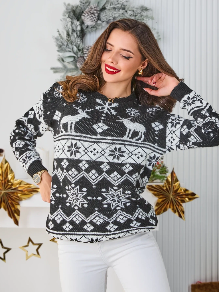 - Този уникален пуловер е същността на комфорта и чара. Изработен от мек материал, пуловерът има кръгло деколте и дълги ръкави. Празничният дизайн добавя изключителен чар!