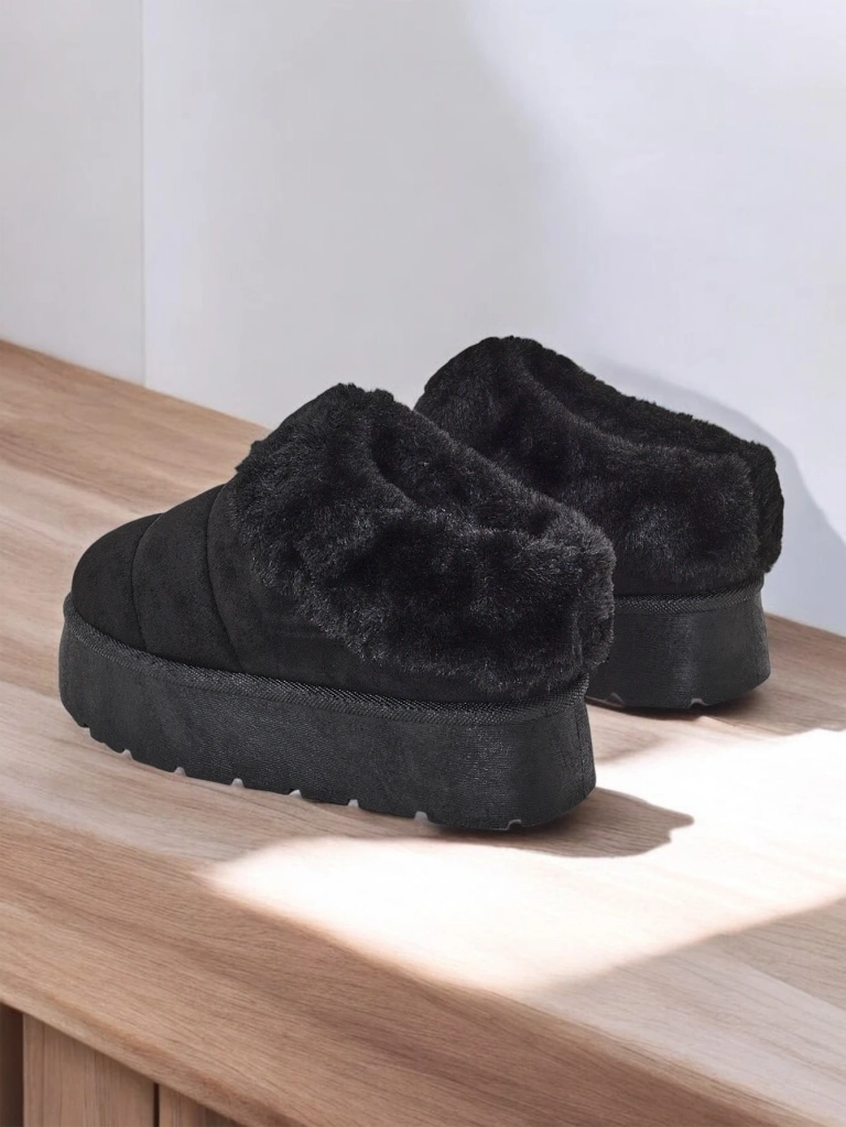 - Мега стилни къси дамски подплатени снежни ботуши от екологична кожа, подобна на велур. Те имат подплата, запълнена с козина. Обувките са на висока платформа - перфектни за зимни ежедневни тоалети!