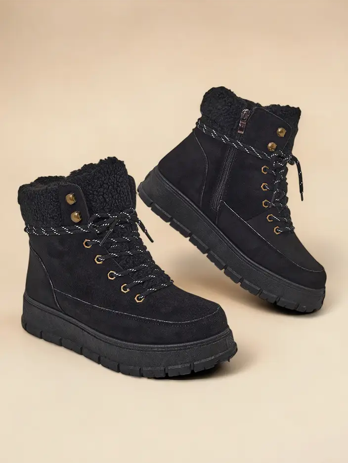 • Вечни дамски снежни ботуши с дебела подметка. Горната част е изработена от велурена еко кожа. Вътрешността е с подплата от пух, а ботушите са с връзки и цип. Перфектни за по-студения сезон!