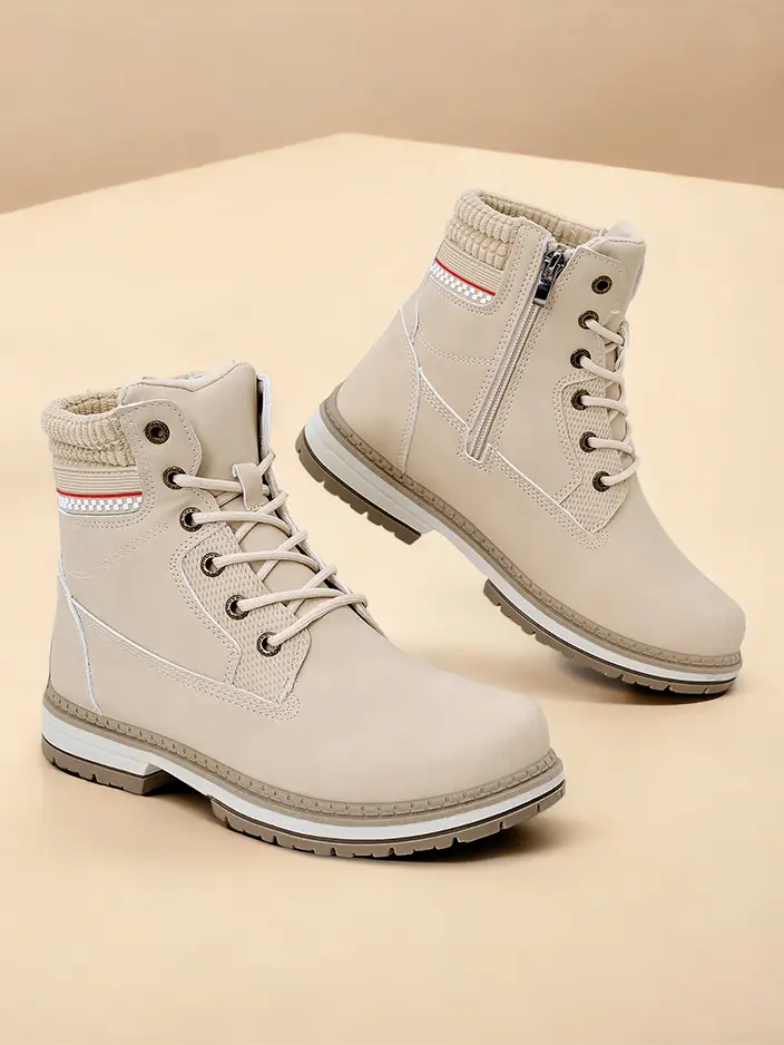 - Дамски трекинг ботуши с връзки и страничен цип. Материалът е еко кожа. Вътрешността на ботушите е подплатена с пух. Идеални за зимата!