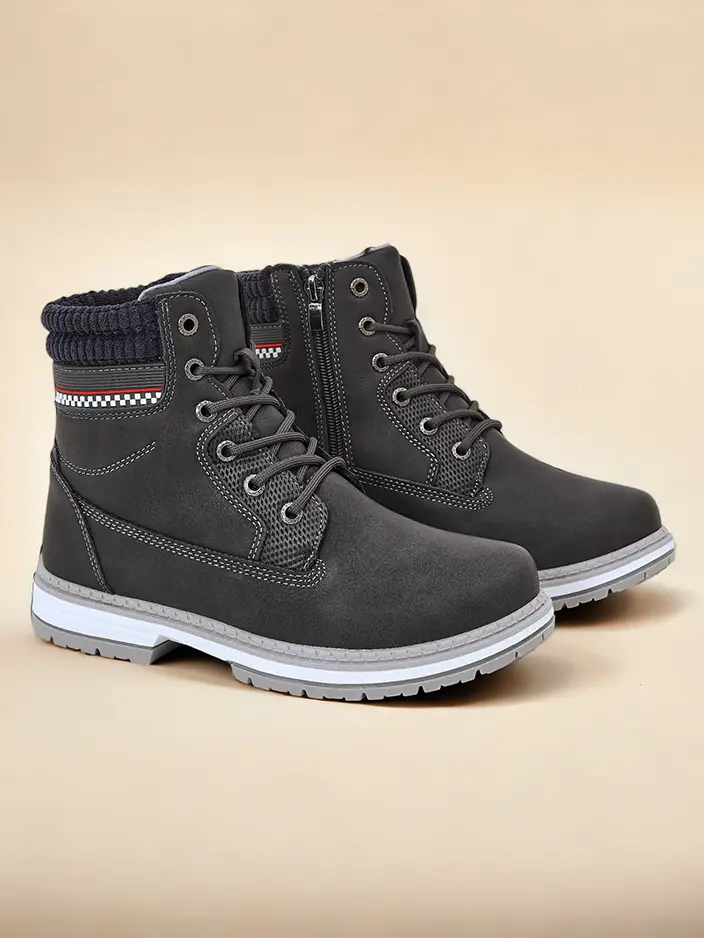 - Дамски туристически ботуши с горна част с връзки и страничен цип. Материалът е от еко кожа. Вътрешността на обувките е с топла подплата от пух. Перфектни за зимно време!
