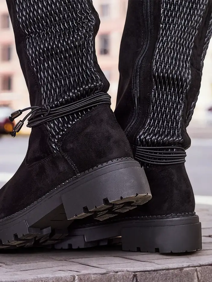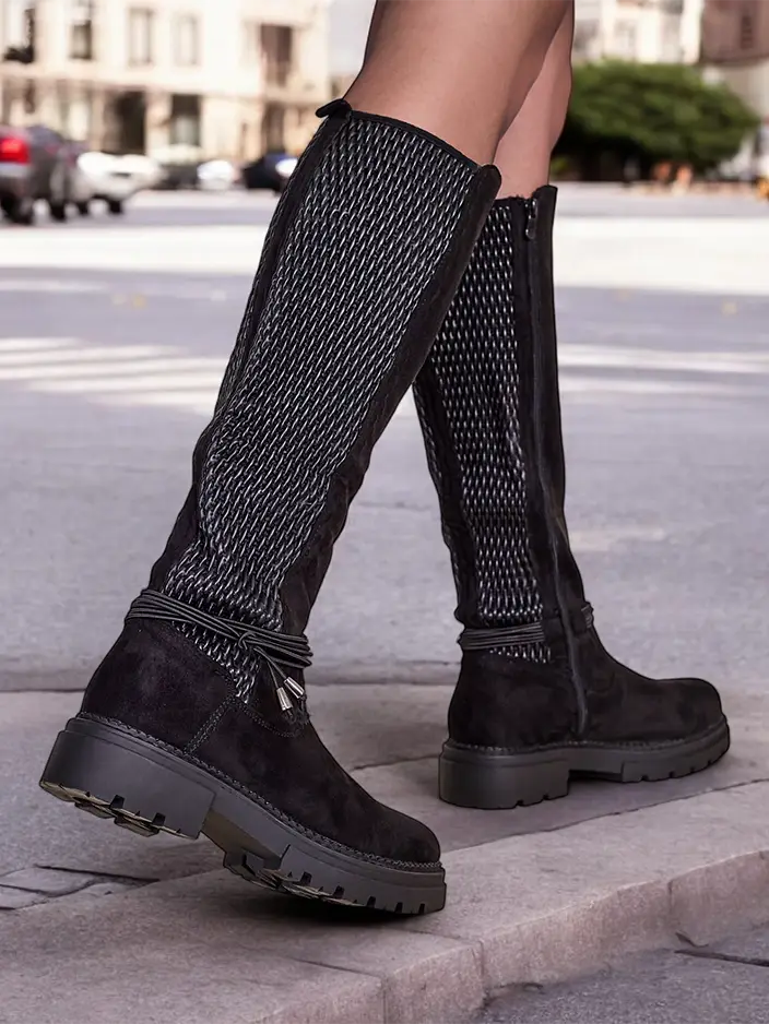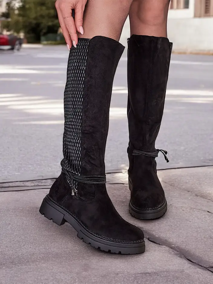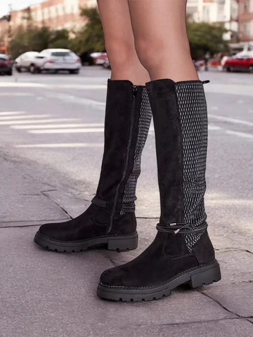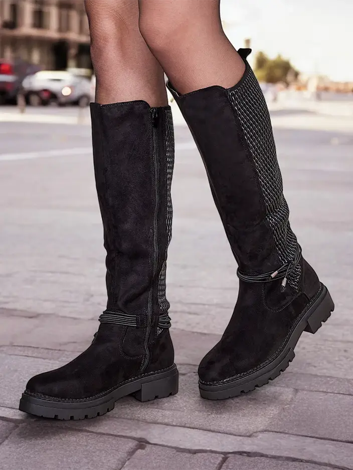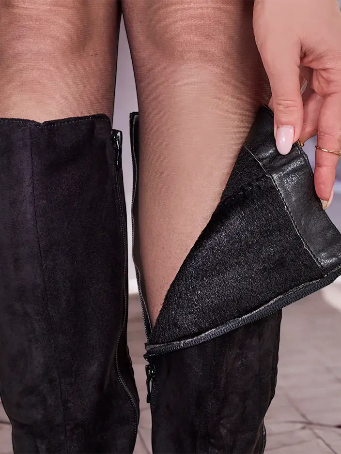 - Високи женски боти, изработени от еко-кожа велур с плосък ток. Вътре с кожена стелка. Моделът се закопчава с цип и има еластичен елемент отзад. Елегантни и стилни с отстраняема декорация!