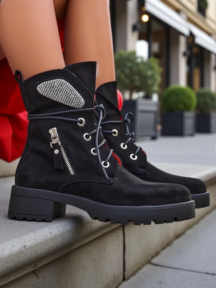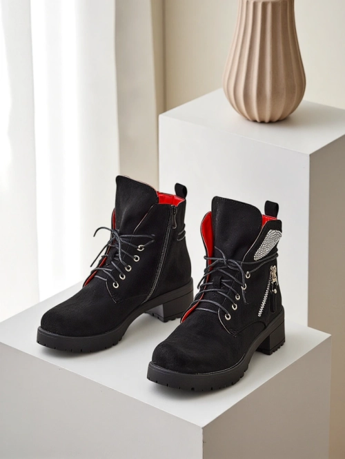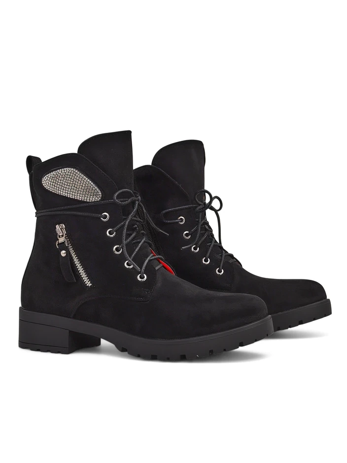 - Женските работни ботуши са изключителни обувки, които съчетават стил и комфорт. Изработени са от екологична велурена кожа и са облицовани с мек косъм. Моделът е с връзки и има цип. Обувките разполагат с фини декорации.