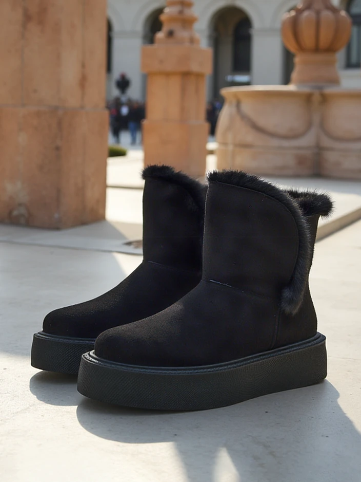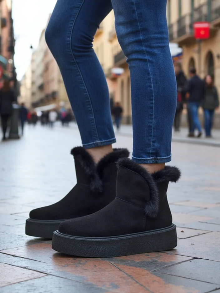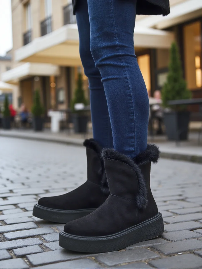 - Страхотни зимни обувки за жени на ниска платформа. Горната част е изработена от изкуствен велур, а интериорът е подплатен с топъл пух. Идеална основа за зимата!