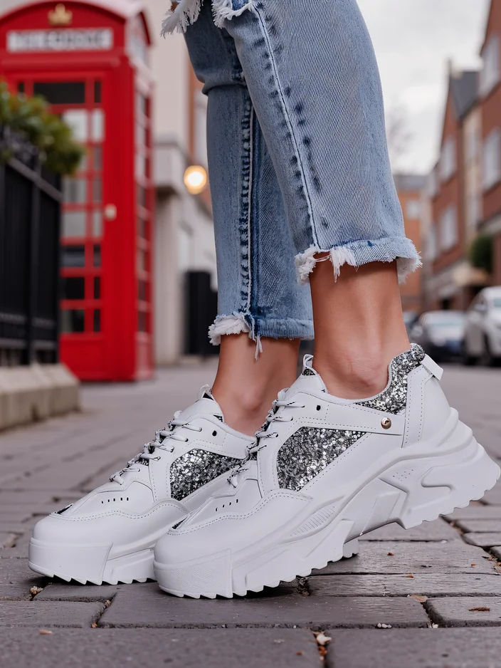 - Дамски спортни обувки в стил маратонки с平 равна подметка. Изработени от еко кожа с акценти от блестящи частици. Стелката е от еко кожа. Отлично допълнение към вашите ежедневни непринудени тоалети!