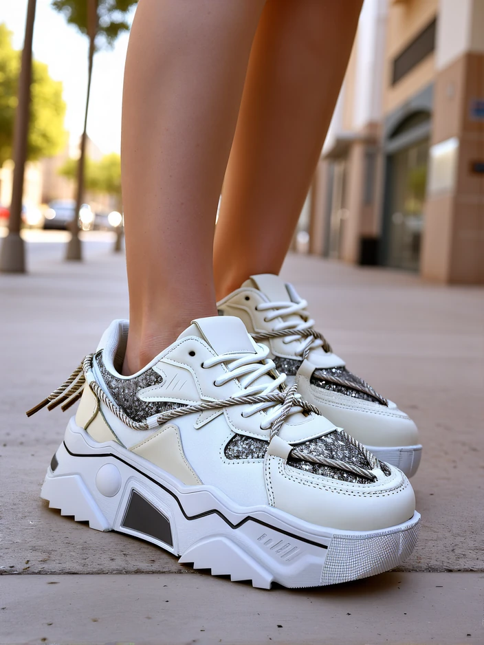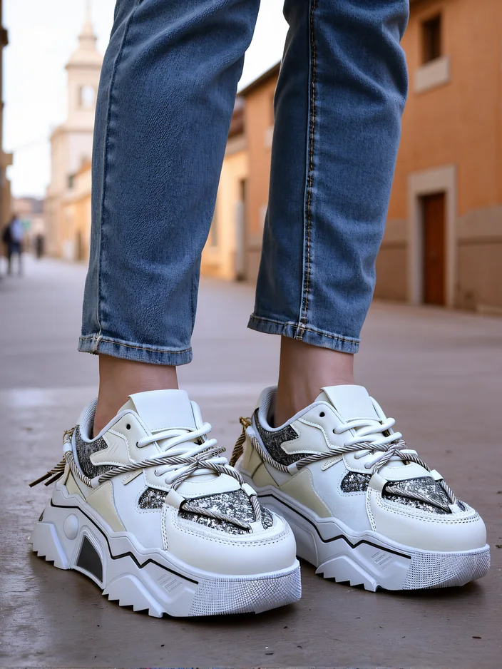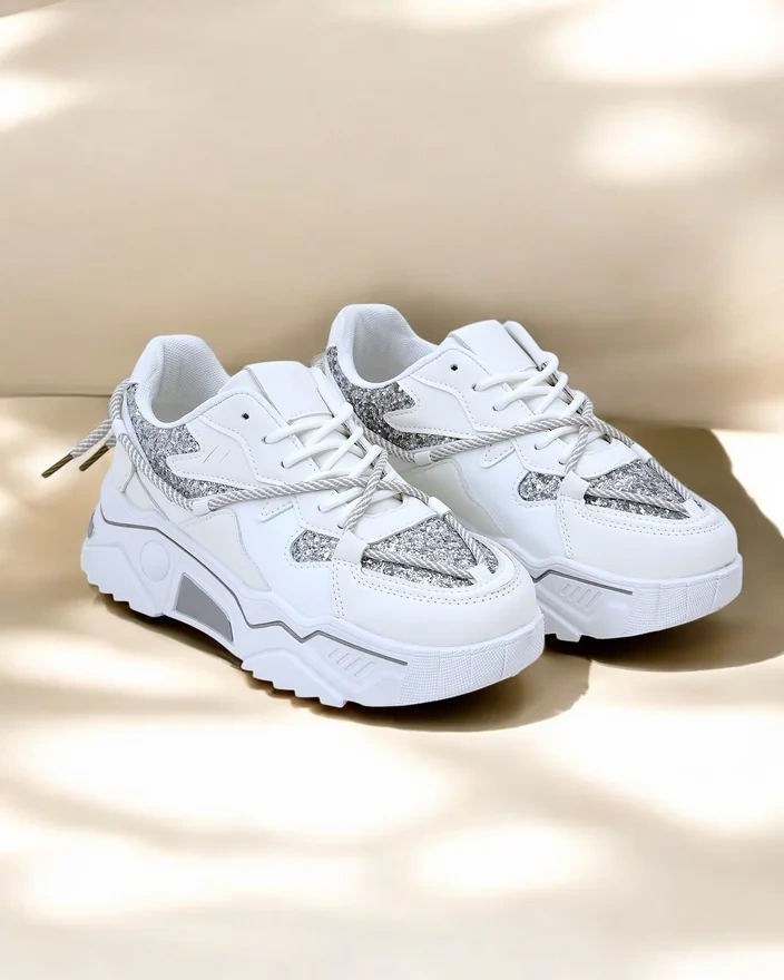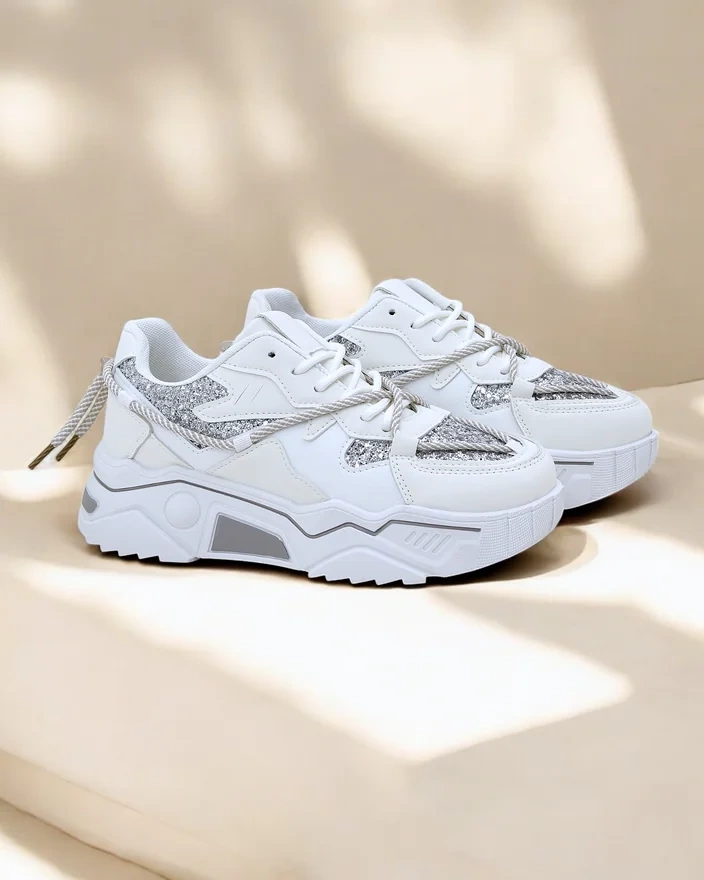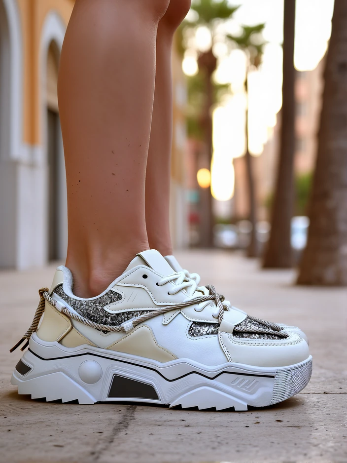 • Дамски спортни обувки в стил маратонки с дебела подметка. Изработени от еко-кожа и текстил, с еко-кожена стелка. Супер допълнение към вашите ежедневни Casual облекла!