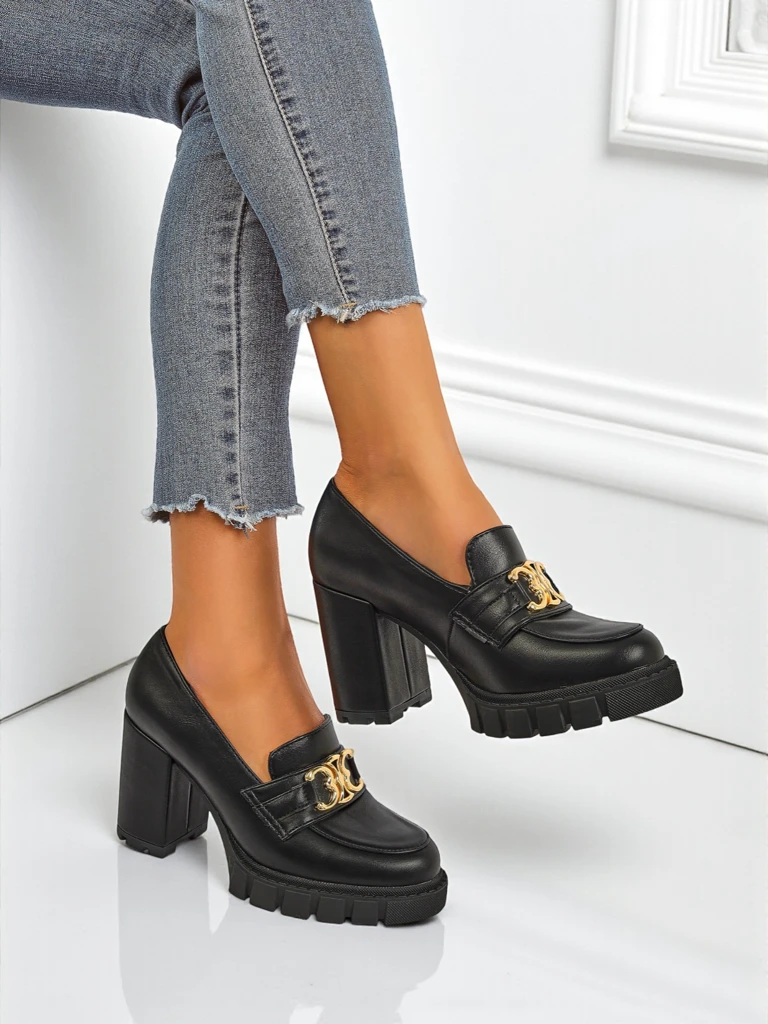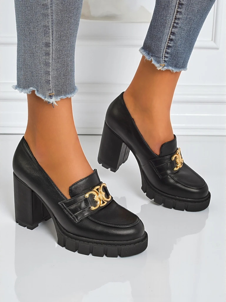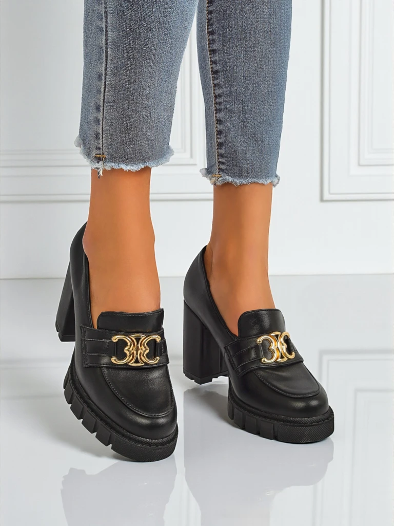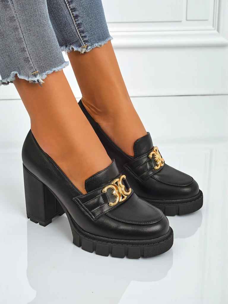 Дамски обувки Nero Aurora на ток със златна катарама, еко кожа