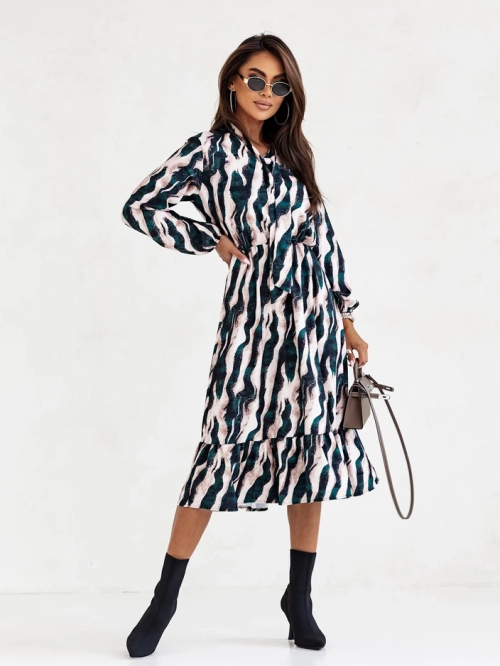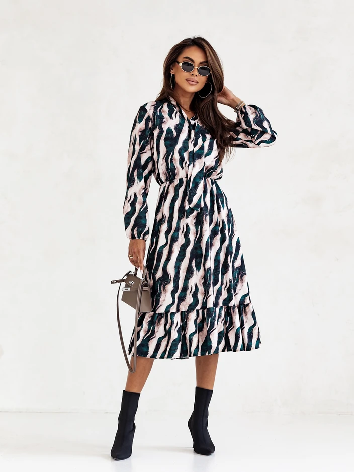 • Женска миди рокля с принт, дълги ръкави и връзка на врата. Моделът разполага с еластичен колан и свободен крой. Перфектна за ежедневна носене! ЗАБЕЛЕЖКА: Точност на измерванията (+/-) 1 см.