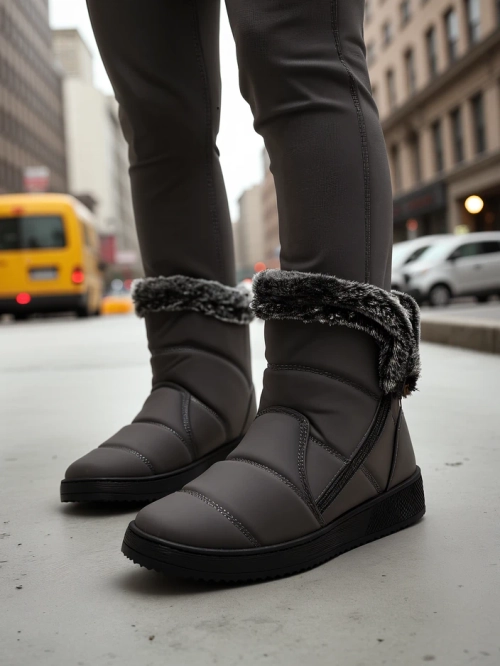 - Страхотни женски зимни снежни ботуши с равна пета. Горната част е изработена от текстил, а вътрешността е изолирана с кожа. Моделът се закопчава с цип. Перфектна основа за зимата!