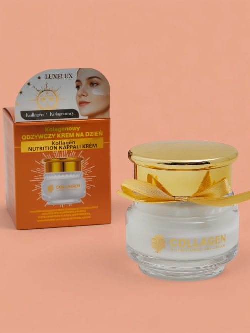 - Открийте луксозния дневен крем Luxelux с колаген, който ще възстанови стегнатостта, хидратацията и естествения блясък на вашата кожа. Благодарение на уникалната си формула, кремът интензивно подхранва, регенерира и предпазва от ежедневни замърсители.