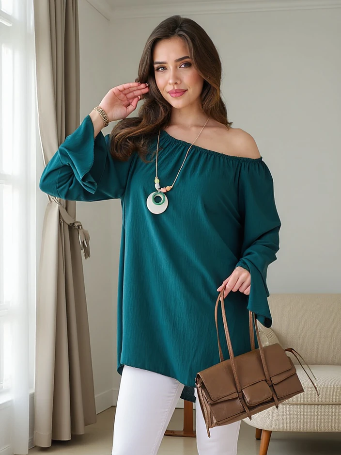 - Изключителна дамска блуза в испански стил, изработена от меко и приятно на допир материали. Има кръгло деколте с еластична част и ръкави, украсени с ръбове. Допълнително, в комплекта е включено и колие. Перфектна е за ежедневието, както и за специални пов
