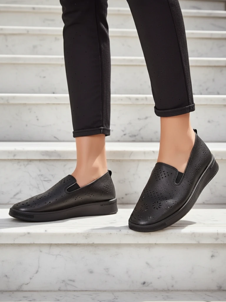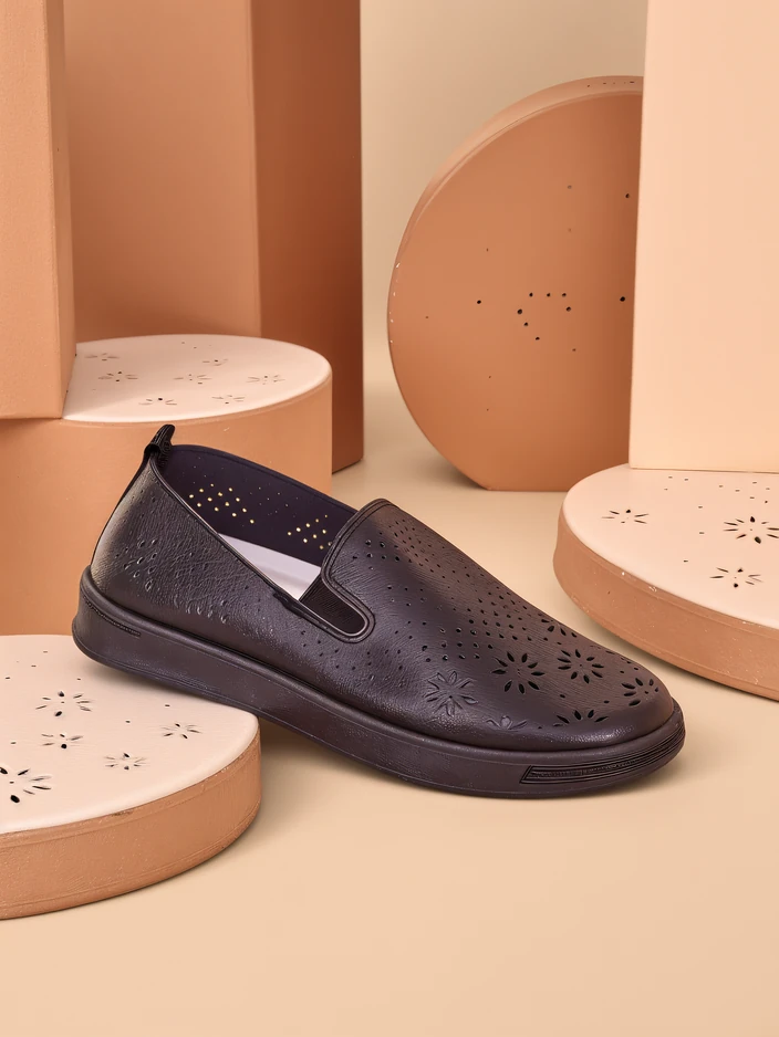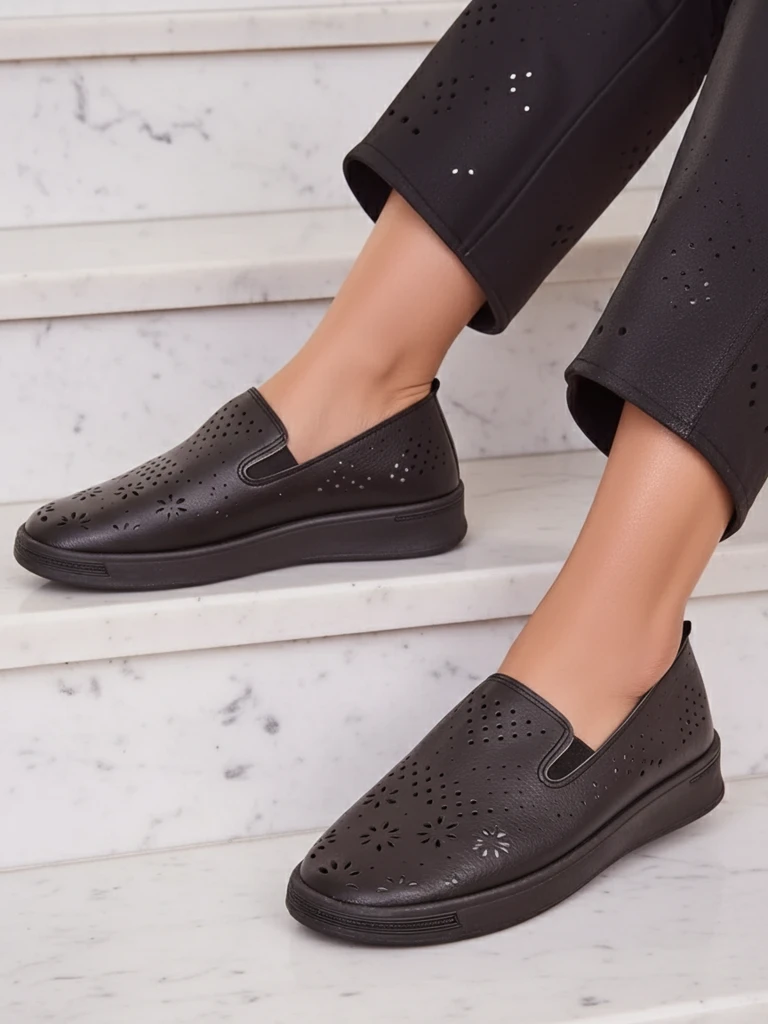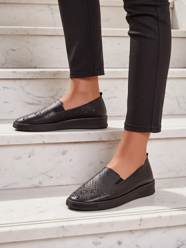 • Спортни дамски мокасини на равна подметка. Класически модел, изработен от еко кожа с ажурна декорация и текстилна стелка. Идеална база за всеки ден!