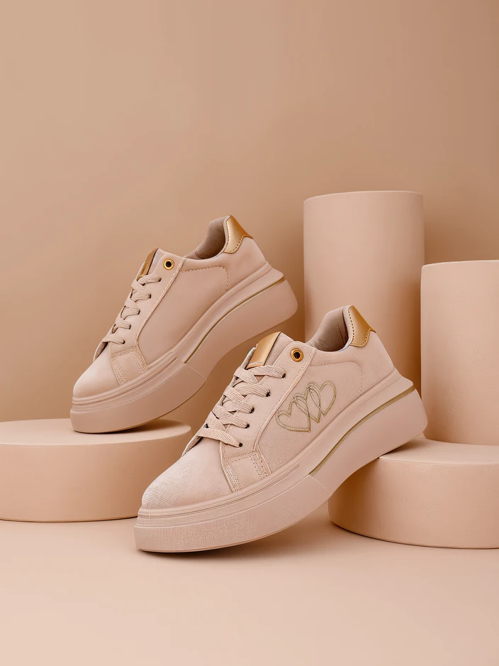 • Женски спортни маратонки с плоска подметка, изработени от еко-suede. Моделът разполага с еко-кожена стелка и е декориран с бродирани сърца. Съчетайте ги с широки панталони и риза!