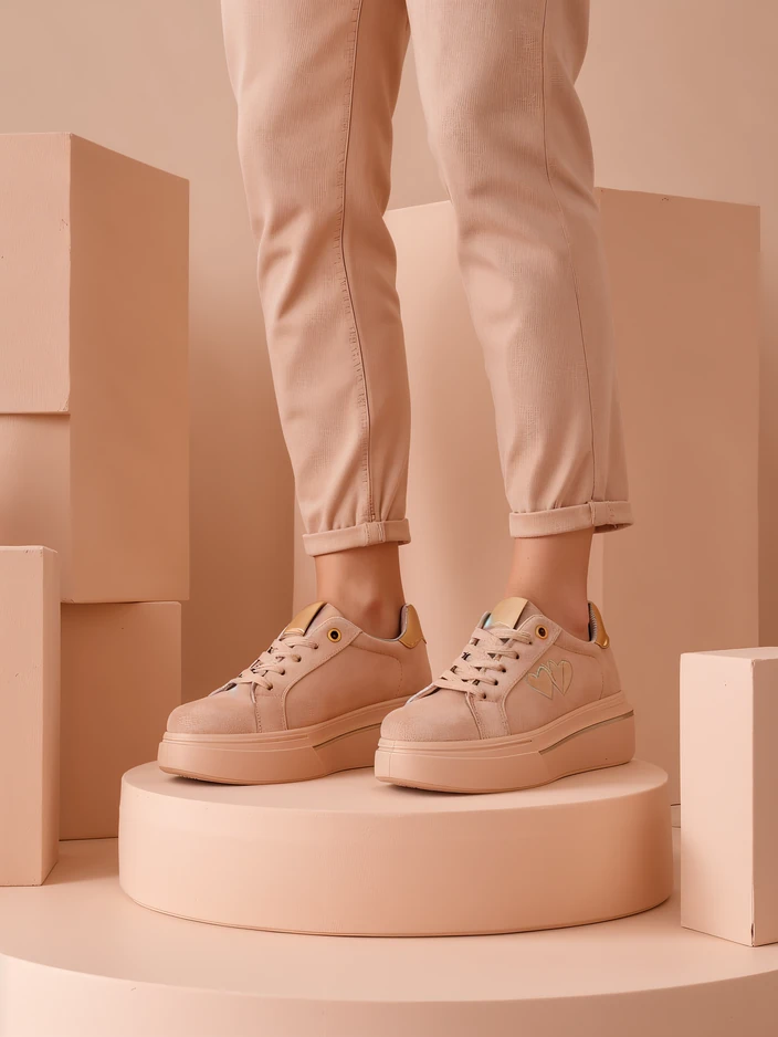 - Дамски спортни маратонки с плоска подметка, изработени от еко-тапицерия. Моделът разполага с еко-кожена стелка и е декориран с бродирани сърца. Съчетайте ги с широки панталони и риза!