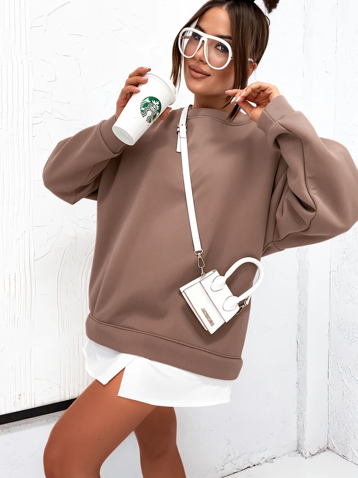 • Добавете чар на вашите аутфити с нашата оувърсайз дамска суитшърт. Тя се наоблича през главата, има кръгло деколте и дълги ръкави. Моделът притежава ципирана отделяща се долна част, която наподобява риза. Перфектна за ежедневието, когато искате да се чувс