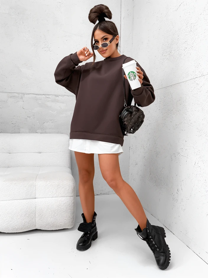 - Добавете чар на вашите аутфити с нашата оувърсайз дамска суитшърт. Тя се наоблича през главата, има кръгло деколте и дълги ръкави. Моделът притежава ципирана отделяща се долна част, която наподобява риза. Перфектна за ежедневието, когато искате да се чувс