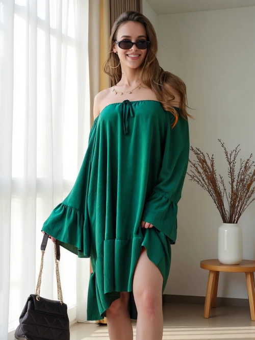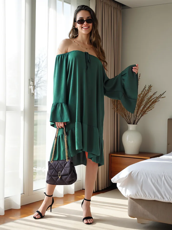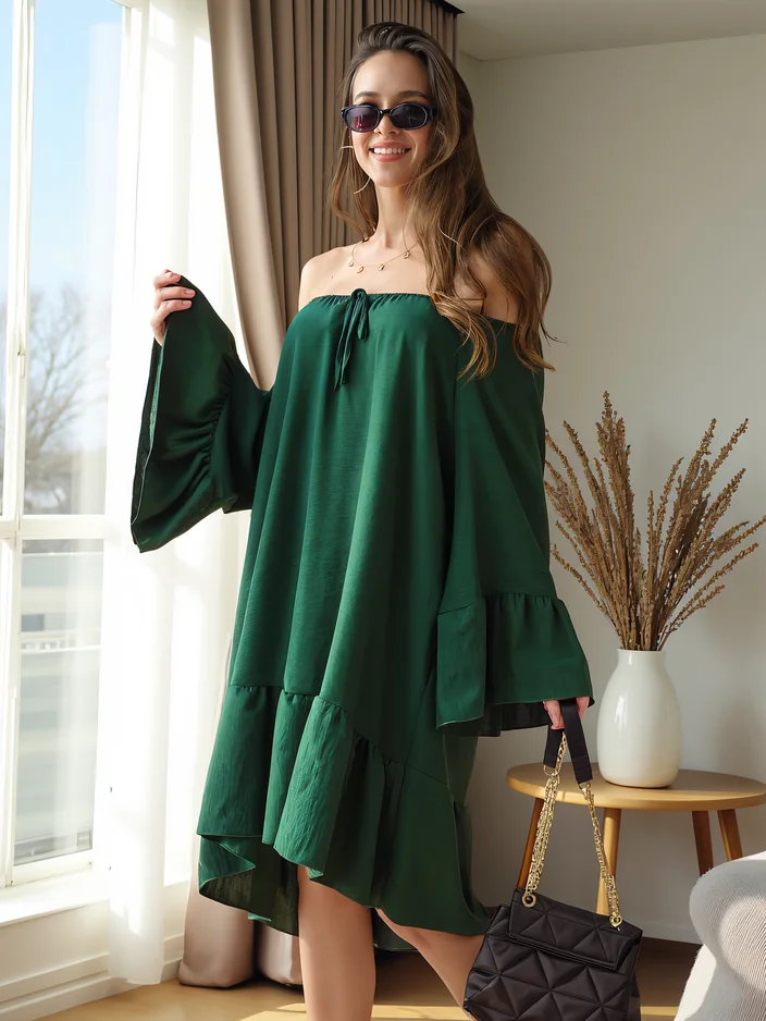 - Уникаална a'la испанска рокля, изработена от лек и въздушен плат. Модел до коленете с дълги ръкави, украсени с ръбове и еластичен деколте, което подчертава силуета. Пълна с чар и лекота!