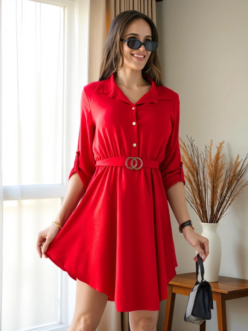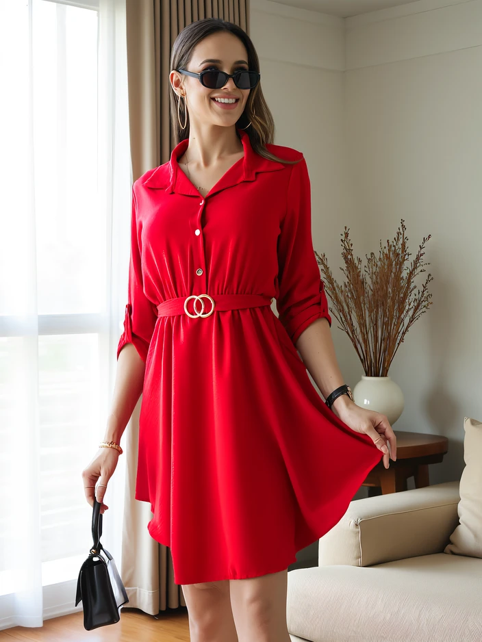 - Една елегантна рокля до коленете с дълги ръкави, които могат да се навият. Разполага с фин колан на талията, който подчертава силуета, и деколте с копчета и класическо яка, което добавя изтънченост и безвременна елегантност. Перфектна за официални поводи!